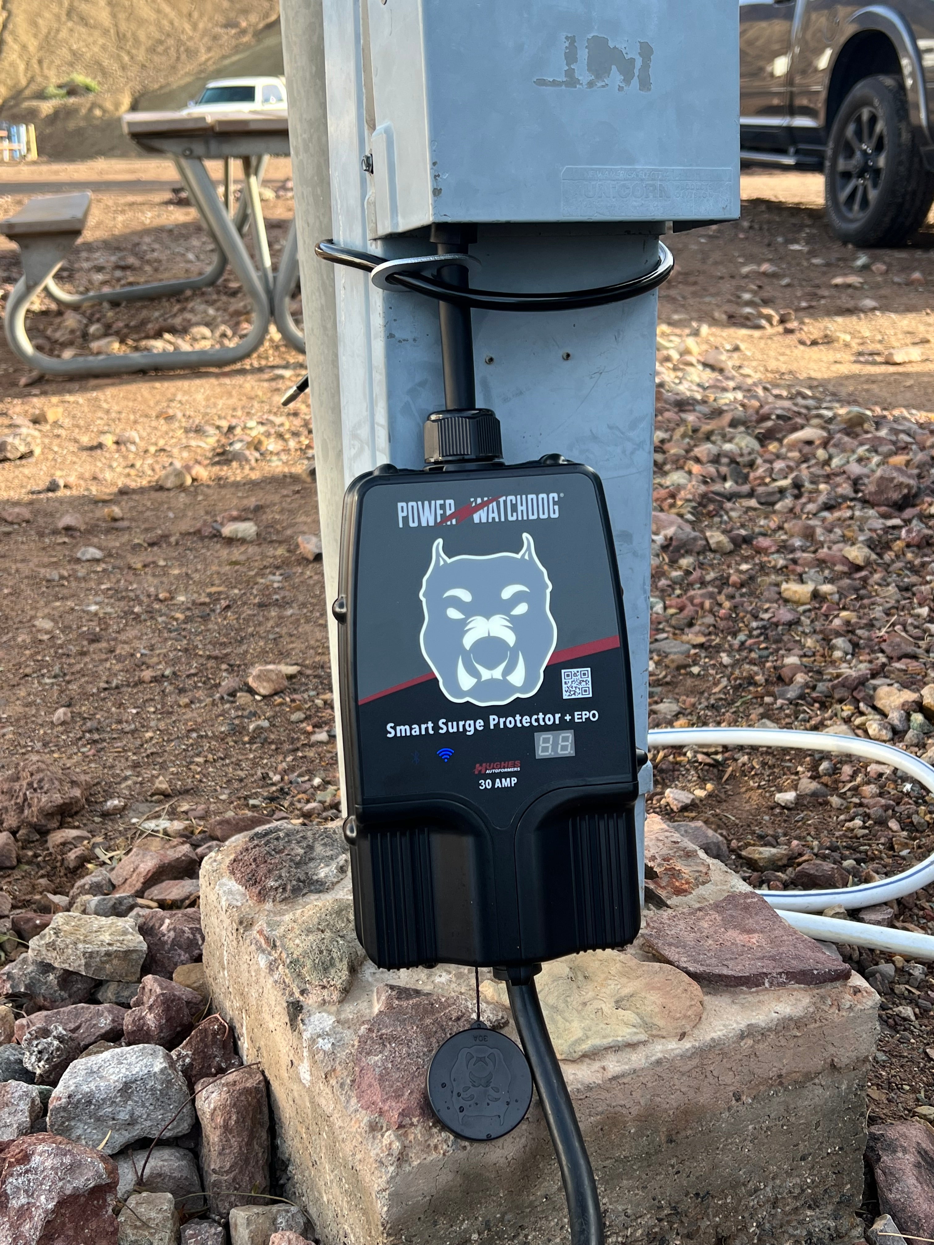 The all-new Power Watchdog Gen 2 RV Surge Protector with EPO: Ultimate surge protection featuring built-in WiFi and Bluetooth for remote monitoring, a lockable lit clamshell bay for secure and easy connections, and a patented replaceable surge module for unmatched convenience.