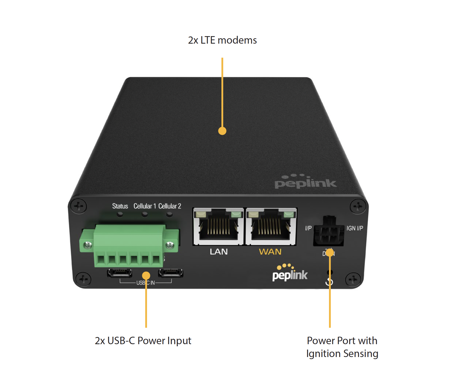 This mobile router is equipped with two embedded cellular modems. This will allow you to utilize two cellular connections at the same time, providing advanced traffic routing and load balancing capabilities as well as near-instant failover from one provider to another. Internet traffic can be routed in a variety of ways using Peplink's proprietary Outbound Policy Management Algorithms. Dual modem devices may be capable of utilizing SpeedFusion technology, also known as "WAN bonding", which may require separate licensing. See SpeedFusion section below.
