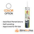This self-leveling roof sealant has been our go-to roof sealant since 2012 and has never failed us with proper maintenance. The Dicor brand of products is trusted in the industry and by top installers for standing up to the test of time while providing excellent waterproofing characteristics on EPDM, Fiberglass and various roof materials popular in the RV industry. If you are installing a roof antenna, solar panels or other equipment that requires a roof penetration and you are sealing on a horizontal (flat) roof surface, then this product is suitable. It offers excellent adhesion to aluminum, mortar, wood, vinyl, galvanized metal, and concrete. Continuously seals and remains flexible. Color-matched, our lap sealants are UV stabilized to prevent discoloration and deterioration and will not stain or discolor any material to which it is applied.