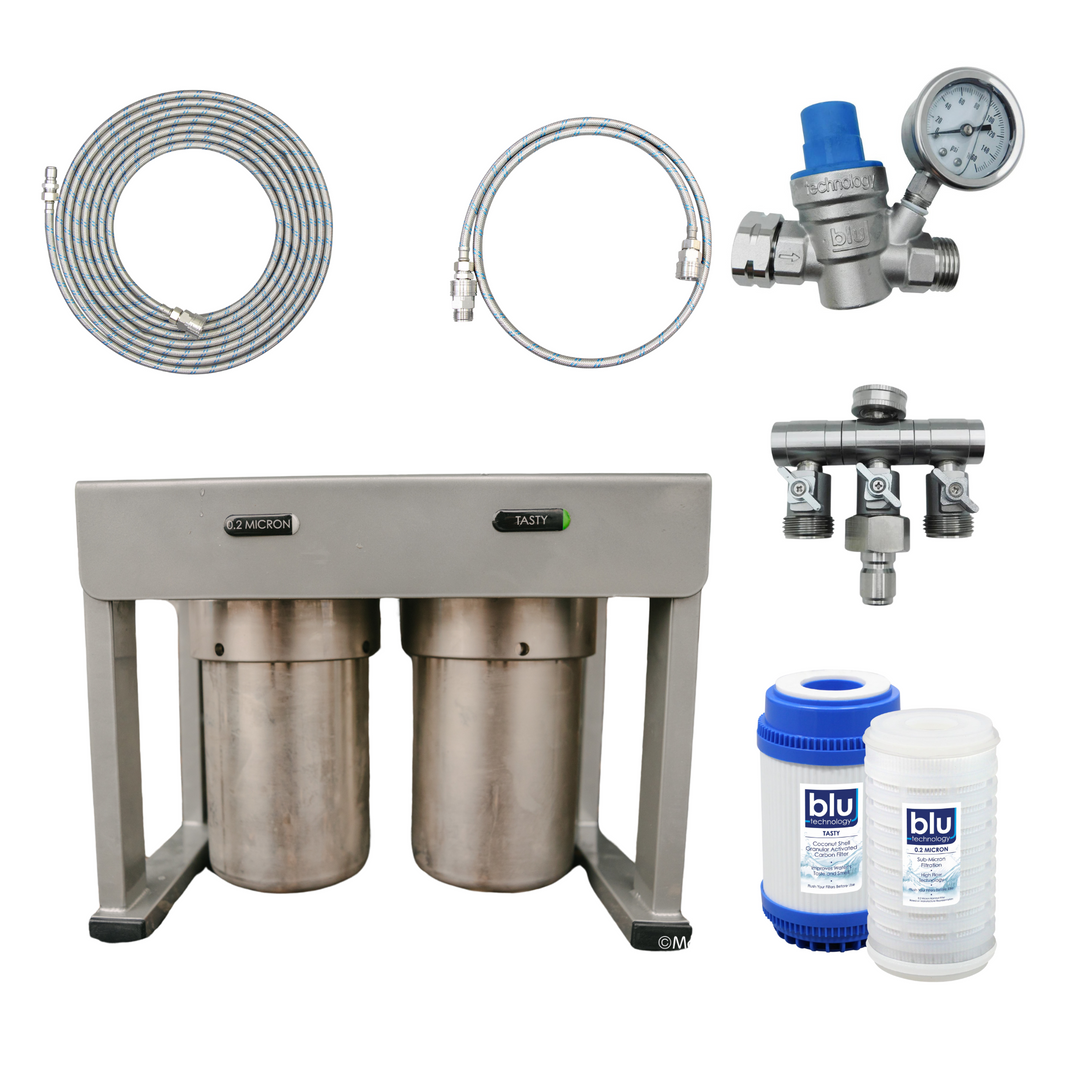 Get clean and tasty water with this premium water filter bundle from Blu Tech. Comes with the exclusive MR3 3-Stage water filter, three filter cartridges, and the hoses and connections to get you started.